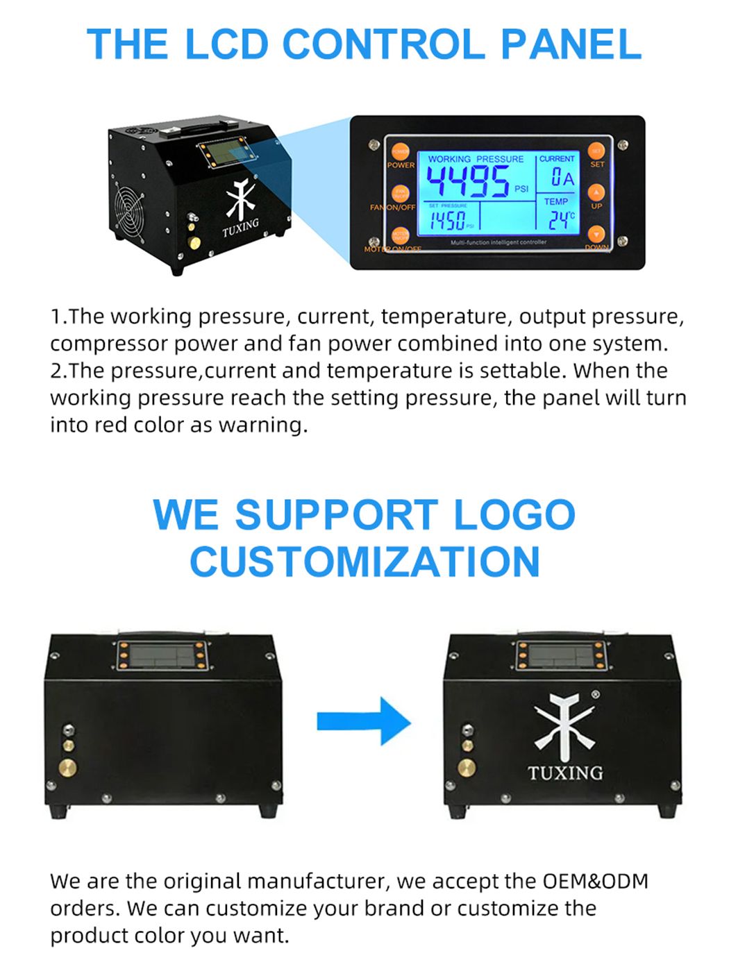 Además, tiene una presión impresionante: capacidad de manejo de 4500PSI/30MPA/300BAR, lo que lo hace adecuado para aplicaciones que requieren aire a alta presión, como en ciertos procesos de fabricación industrial, tareas de reparación de automóviles donde se necesita aire a alta presión para operaciones específicas , e incluso en algunos proyectos de construcción. Ya sea que esté en un taller industrial, un sitio de construcción o un taller de reparación automotriz, este compresor de aire de 12V con sus características avanzadas es una opción confiable para todas sus necesidades de compresión de aire.